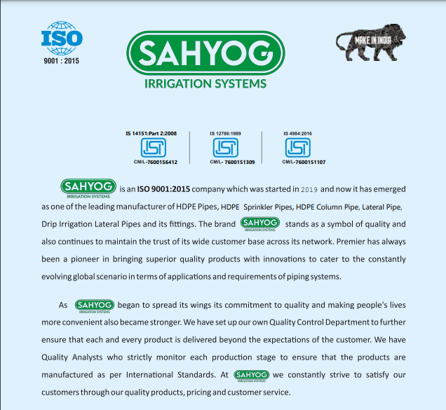 SAHYOG is an ISO 9001:2015 company which was started in and now it has emerged as one of the leading manufacturer of HDPE Pipes, Drip Irrigation Lateral Pipes and its fittings. The brand SAHYOG stands as a symbol of quality and also continues to maintain the trust of its wide customer base across its network. Premier has always been a pioneer in bringing superior quality products with innovations to cater to the constantly evolving global scenario in terms of applications and requirements of piping systems.
