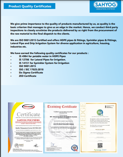 We are ISO 9001:2015 Certified and offers HDPE pipes & fittings, Sprinkler pipes & Fittings, Lateral Pipe and Drip Irrigation System for diverse application in agriculture, housing, industries etc.